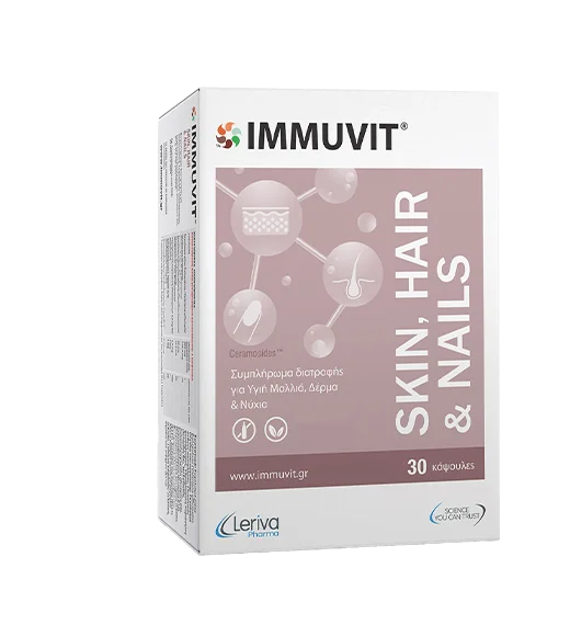 Το Immuvit Skin, Hair & Nails είναι ένα συμπλήρωμα διατροφής που περιέχει σημαντικές ποσότητες βιοτίνης, νιασίνης, Βιταμίνης C, Ψευδάργυρου και Χαλκού. Επιπλέον, περιέχει Βιταμίνη Α, εκχύλισμα Bamboo (ως πηγή πυριτίου) και CeramosidesΤΜ (πολικά λιπίδια σιταριού).