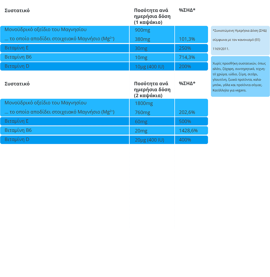Το Magnevit Sport είναι ένα συμπλήρωμα διατροφής που περιέχει Μαγνήσιο σε πατενταρισμένη μορφή Μονοϋδρικού Οξειδίου του Μαγνησίου, μαζί με βιταμίνες D, Ε και Β6, οι οποίες δρουν συνεργιστικά με το μαγνήσιο.