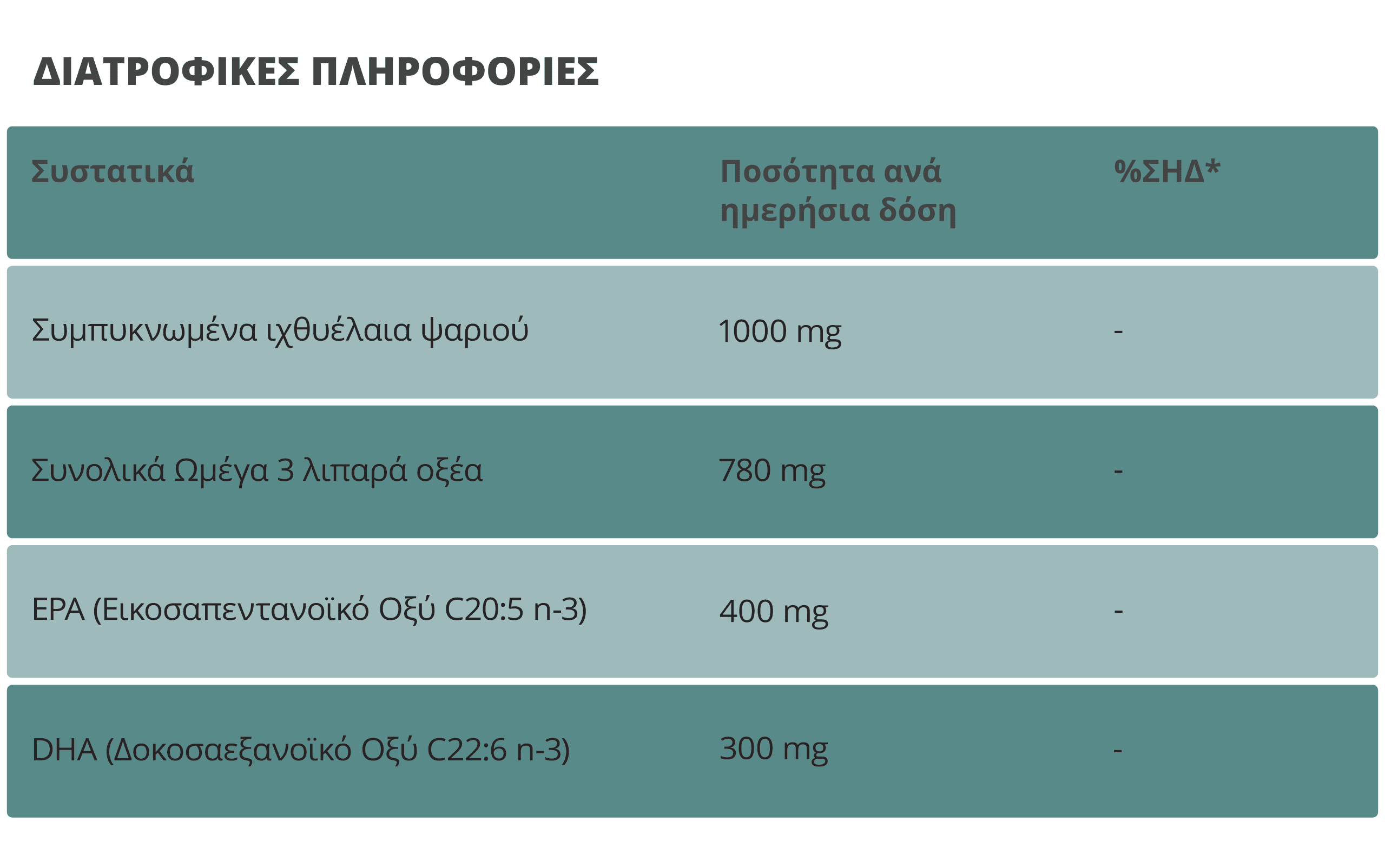 Τα Ωμέγα 3 λιπαρών οξέων EPA και DHA συμβάλουν στην φυσιολογική λειτουργία της καρδιάς, στη διατήρηση φυσιολογικών επιπέδων τριγλυκεριδίων στο αίμα και μιας φυσιολογικής πίεσης, Το DHA συμβάλλει στη διατήρηση της φυσιολογικής λειτουργίας του εγκεφάλου και της φυσιολογικής όρασης.
